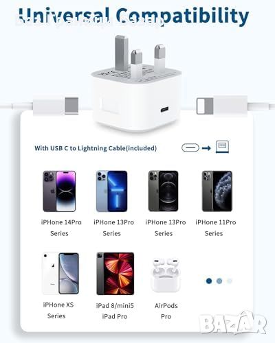 Съвместимост: Поддържа всички модели iPhone от 6 до 14 Pro Max, iPad Pro, AirPods и други устройства с Lightning порт.