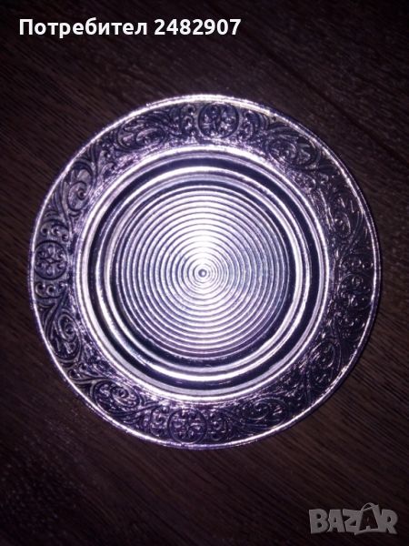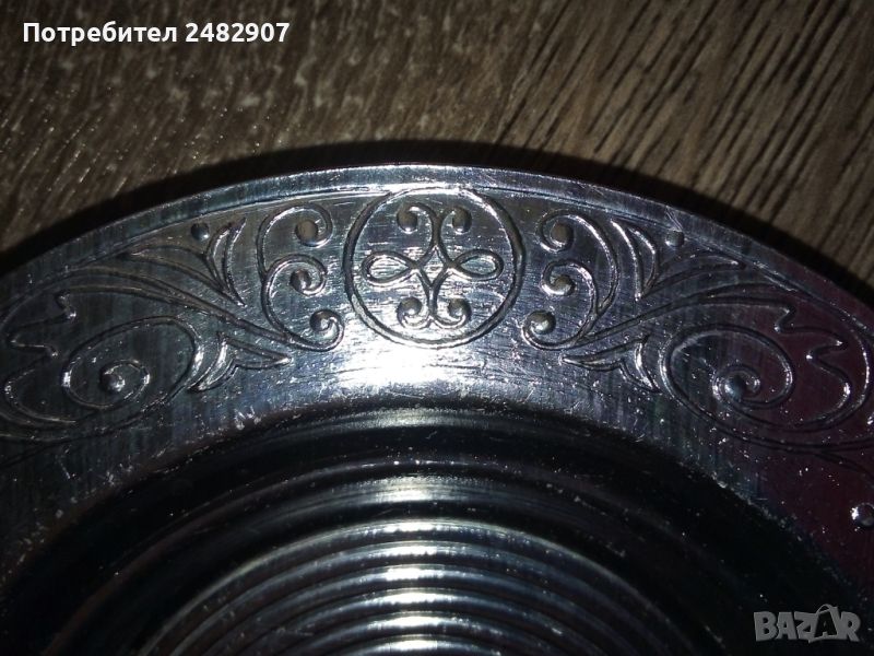 Малка стара метална чинийка с красиви орнаменти от времето на соца. Диаметър в горната част - 11,5 см. Много запазена, без забележки.