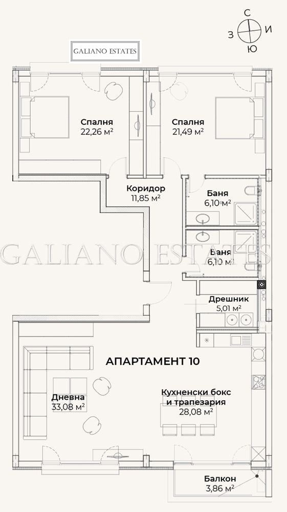 Galiano Estates с удоволствие Ви представя впечатляващ апартамент, съчетаващ уют, практичност и стил. Жилището е разположено на втори жилищен етаж, в комплекс от затворен тип, разкрива невероятни гледки, тишина и много зеленина. В подножието на планината, комплексът предлага спокойствие и уединение в забързаното ежедневие на града. Имотът е завършен с висок клас материали, а мебелите са италиански, по индивидуален проект. На територията на комплекса има изградено видеонаблюдение и охрана, контролираща достъпа. Към жилището може да бъде закупено паркомясто/гараж, срещу допълнително заплащане. Обявената цена е без включен ДДС. В комплекса се предлагат и други апартаменти и къщи.