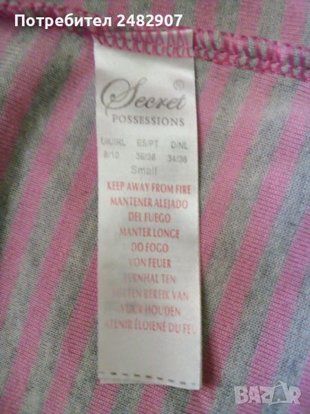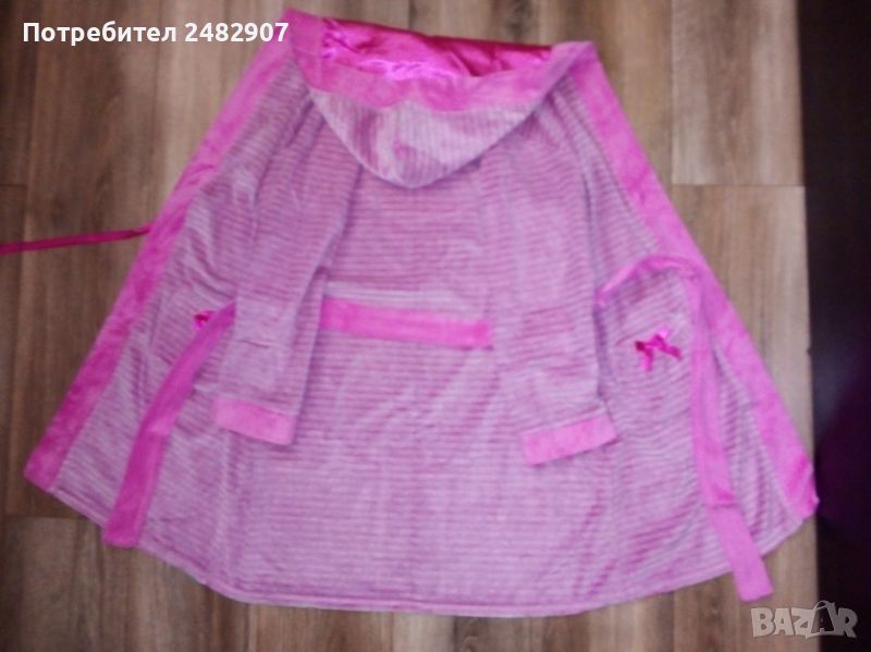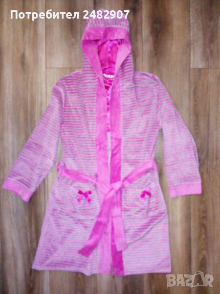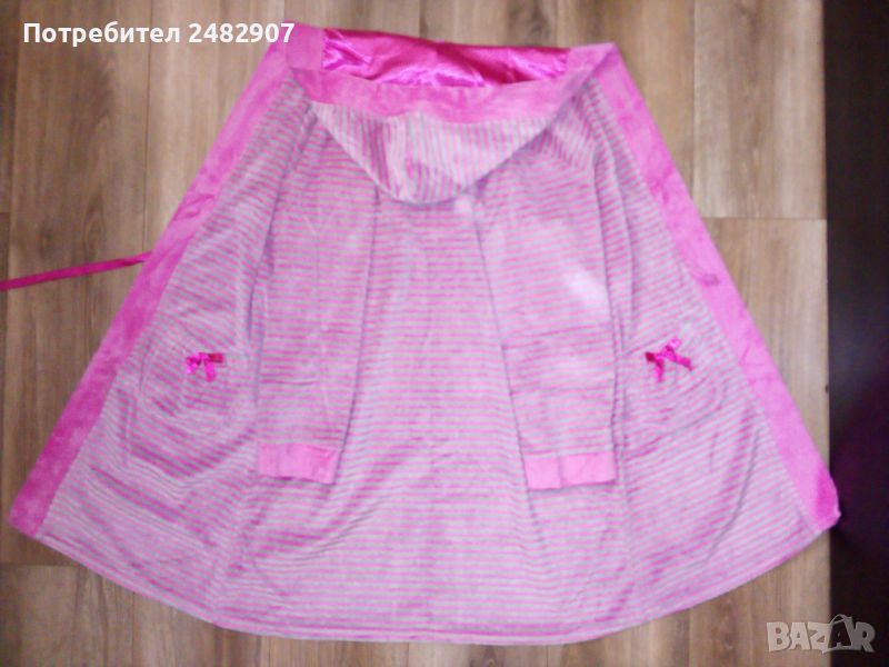 Детски плюшен халат за момиче в розово и сиво за възраст - 8-10 години. Съдържа 80 % памук и 20 % полиестер. Ширина в раменете - 42 см, ширина под мишниците - 50 см, дължина от рамото до долу - 85 см, дължина на ръкава от рамото - 50 см, ширина на ръкава в долната част - 14 см. Много запазен, почти не е използван, отлично състояние, без забележки, с качулка, колан и два джоба.