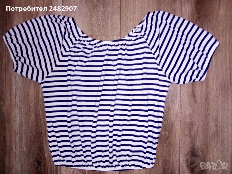 Дамска блуза с къс ръкав на бели и тъмно сини раета, размер 38. Съдържа 100 % полиестер. Ширина под мишниците - 58 см, ширина в долната част - 32 см, дължина от рамото до долу - 50 см. Много запазена, почти не е използвана, с ластик на деколтето, ръкавите и долната част.