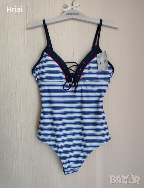 4. Страхотен нов цял бански на немски бранд. С етикет и хигиена лепена, М размер. Тънките презрамки се регулират, както и деколтето чрез кръстосаните връзки. Има леки подплънки, които могат да се махат.