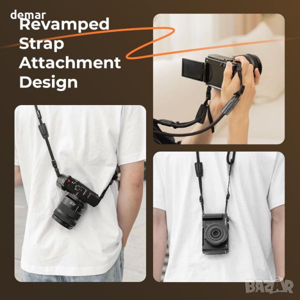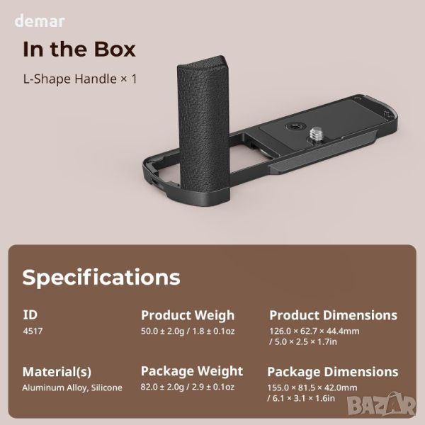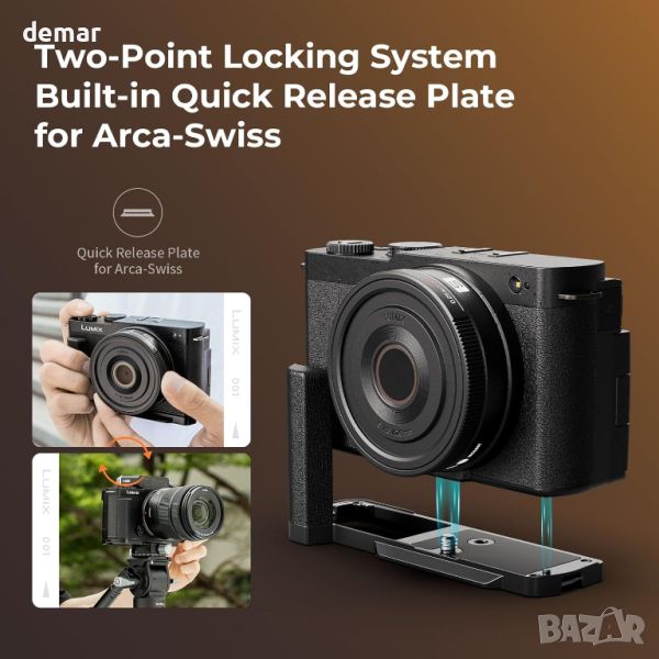 L-образната дръжка на Panasonic LUMIX S9 - SmallRig 4517 е проектирана специално за фотоапарата LUMIX S9, като предлага подобрена ергономична силиконова дръжка за комфорт и сигурност. Той съответства на текстурата и цвета на фотоапарата, като се отличава с ултратънък дизайн с нетно тегло от само 50 g за компактност. Дръжката осигурява стабилност с двуточкова заключваща система и включва вграден плосък ключ за лесно сглобяване. Освен това има интегрирана плоча за бързо освобождаване за съвместимост с Arca-Swiss, отвори с резба 1/4"-20 за плочи Manfrotto и двойни отвори за лента за удобно вертикално снимане и защита от удар.