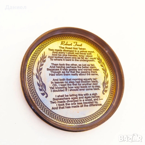 Капакът и вътрешността носят гравирани редове от класическото стихотворение на Робърт Фрост „Пътят не е поет“ – послание за изборите в живота и смелостта да следваш свой собствен път.