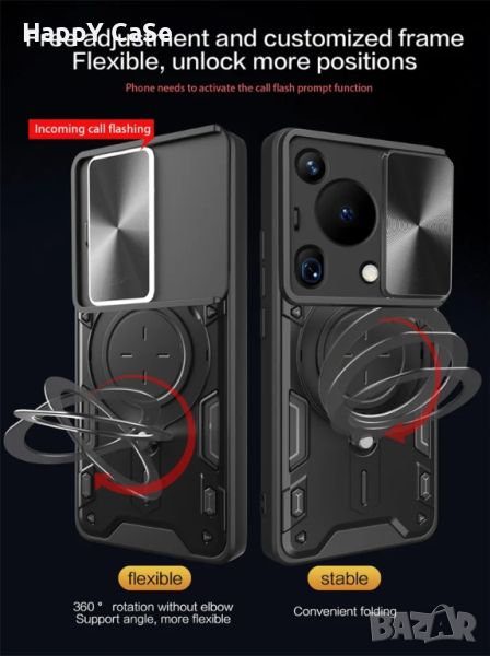 Снимки от 9 до 12 са на кейсове за Pura 80 Ultra / 80 Pro / 70 Pro. При тях капачето предпазващо камерата се отваря настрани чрез завъртане около оста на нита който го държи.