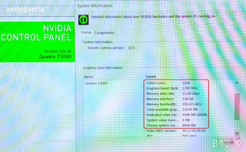 Картата е NVidia Quadro T2000 4GB GDDR6 128bit. 1024 Cuda Cores.,