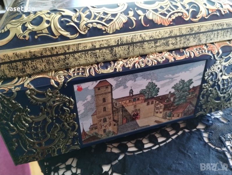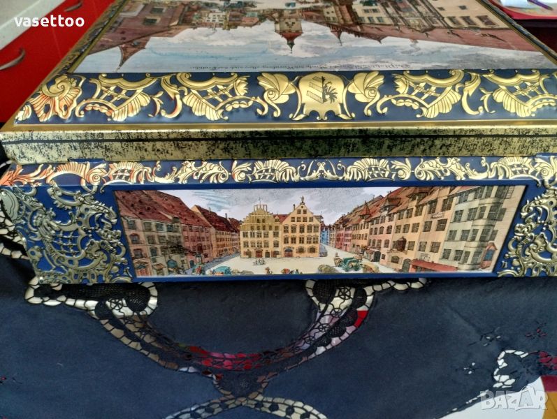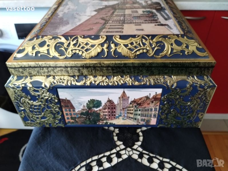 Много голяма немска метална кутия с многостранна декорация на исторически забележителности с минимални следи от времето.Размери17/41/29.5см.Моля, разгледайте и другите ми обяви, има много красиви неща!