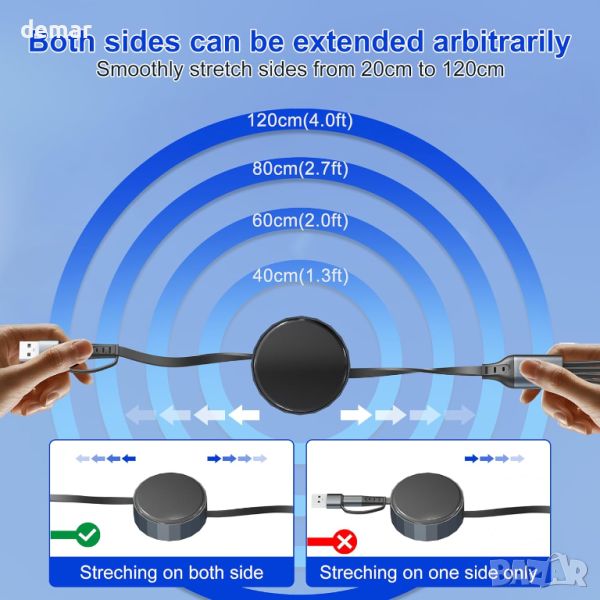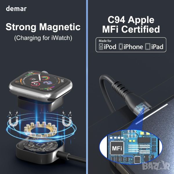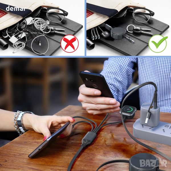 4 в 2 USB A/C прибиращ се многофункционален кабел за бързо зареждане предлага 8 метода за зареждане, включително USB C/A към iWatch, Lightning, Type C и Micro USB. Поддържа зареждане на 4 устройства едновременно, спестявайки място и пари. С помощта на 100W PD технология, той зарежда iPhone 15 Pro до 92% за 35 минути и MacBook Pro до 100% за 1,9 часа. Регулируемата дължина се простира до 1,2 метра и се прибира за лесно съхранение, идеален за пътуване. Магнитното зарядно устройство iWatch е MFi сертифицирано, което гарантира безопасно и съвместимо зареждане за всички серии Apple Watch и различни устройства, включително iPhone, iPad, MacBook и телефони с Android. Издръжлив с медна жица с висока чистота, той гарантира дълготрайна работа.