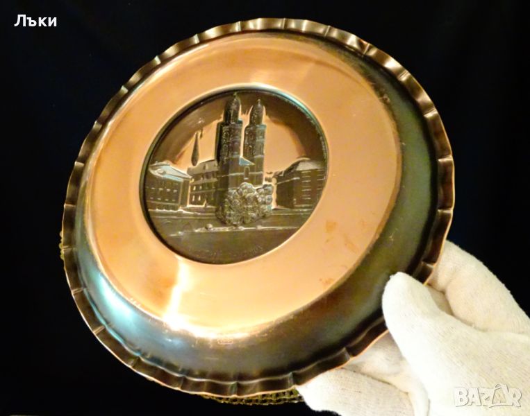 ръчна изработка от свръх масивна и високо качествена червена мед с ослепителен блясък.В центъра има прецизно релефно отлято изображение на протестантската църква Grossmünster в столицата Zürich.Бордюра на паното е декориран с красив кован релеф.Маркирано с инициалите на SiGG Switzerland.Фабриката е
