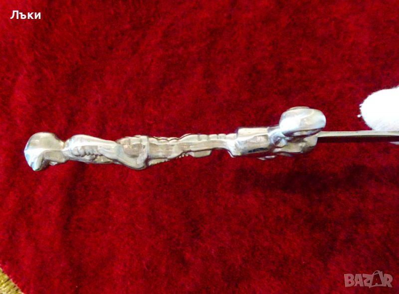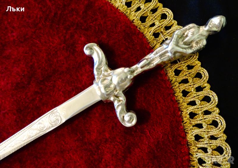 дръжка от калай - прецизно изваяна фигура на рицар тамплиер с меч.Острието е изработено от жилава,яка стомана със