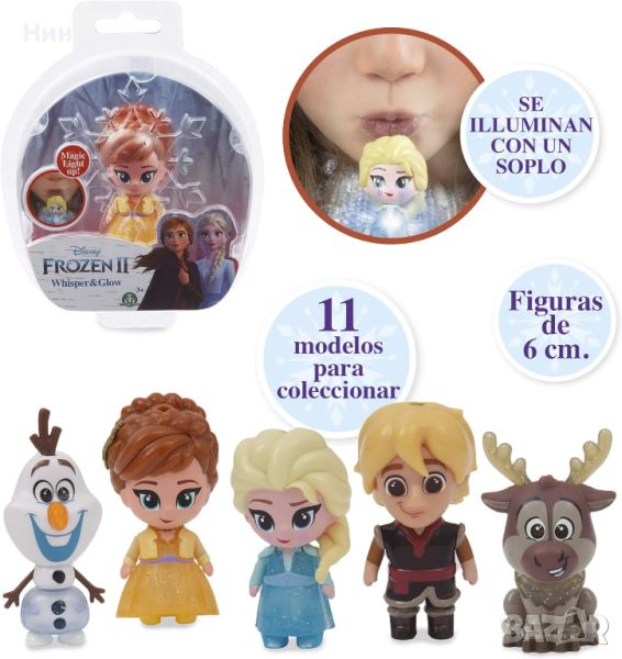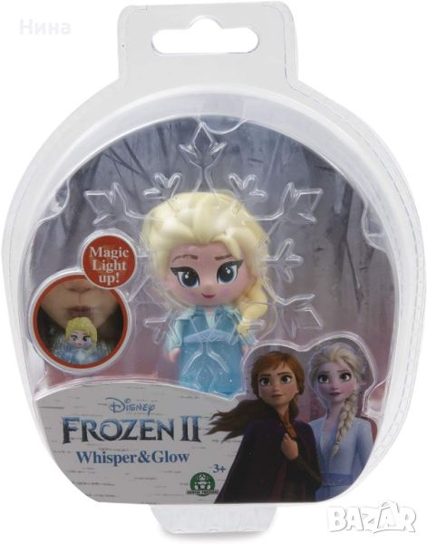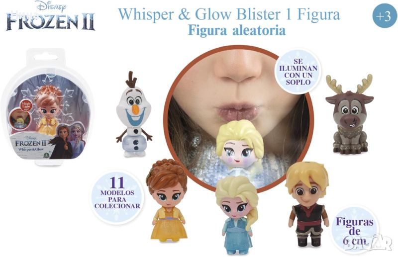 Светеща мини фигурка Frozen II Whisper & Glow ❄️ която е с височина около 6 см и има свой собствен цвят, и всеки път, когато духнете върху нея, променя цвета си в шест различни нюанса: светло синьо, зелено, розово, червено, оранжево и жълто!