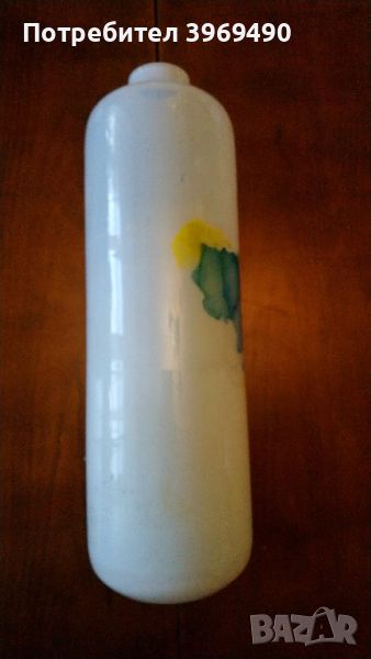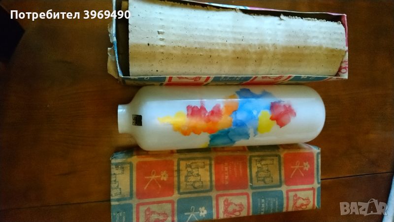 Ваза " Експресия " голяма.Произведена в комбинат за порцелан и стъкло " Китка " - Нови Пазар 1990 г.Бяла с цветни елементи.Материал калиево стъкло.Размери на вазата ф100*315 мм..Размери на гърлото ф40 мм..Вазата не е използвана и е в оригиналната опаковка.