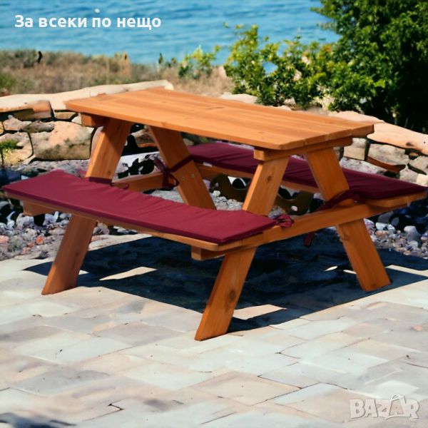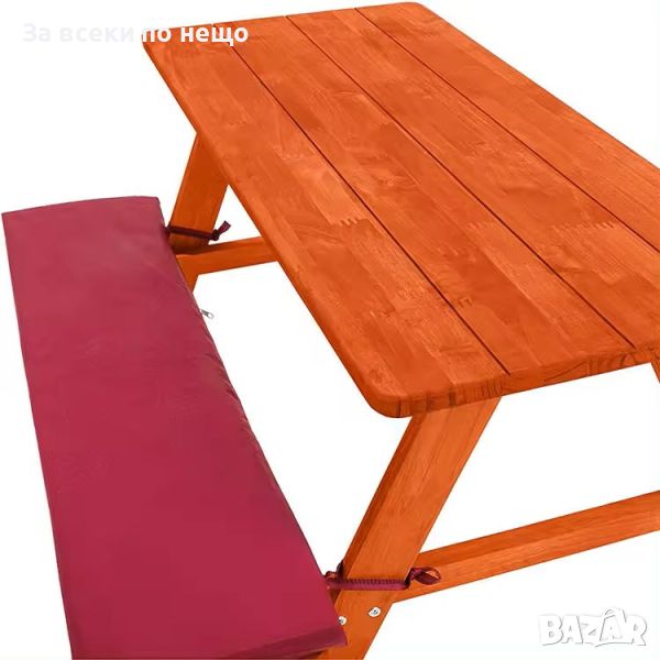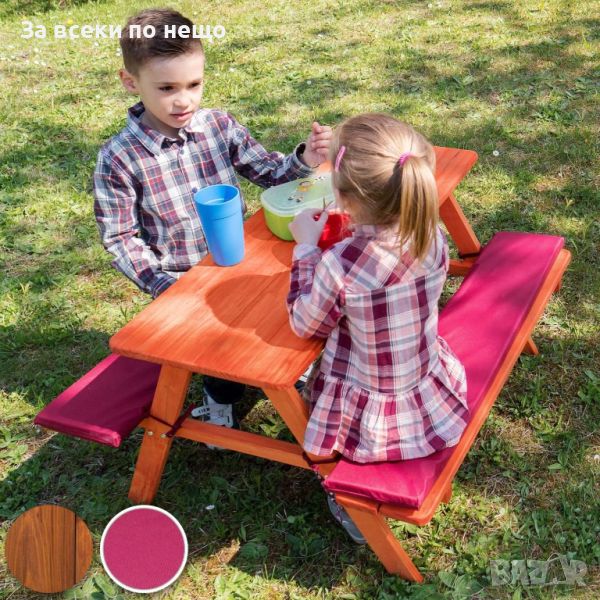 Детска маса с пейки за пикник е стабилна, с безопасно заоблени ъгли и ръбове, с меки подплатени възглавници за сядане.