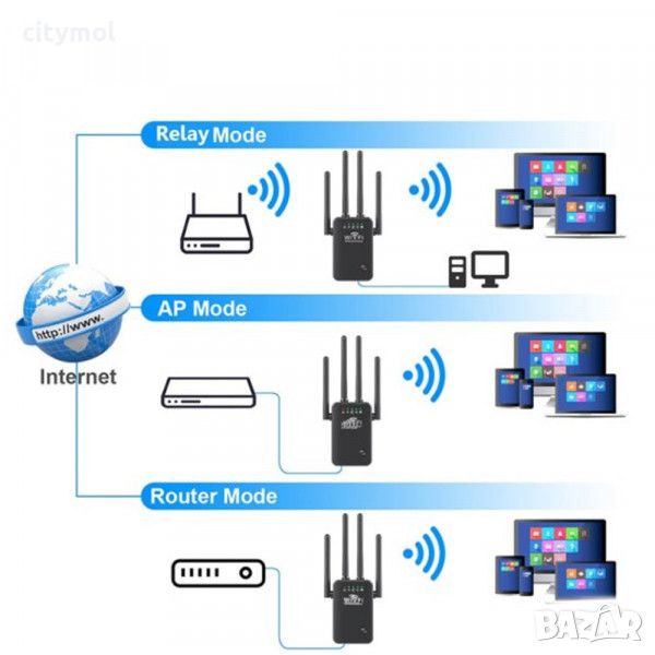 Безжичният Wifi Repeater се използва главно за предоставяне на безплатна WiFi услуга в голям район, като фабрика, голяма къща, улица и т.н.
