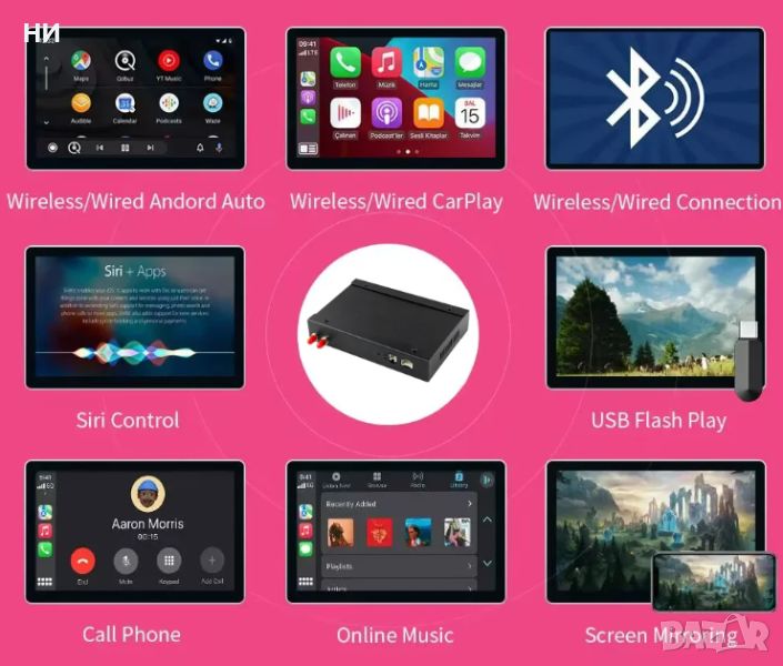 Функции: 1) Безжичен Apple Carplay 2) IOS AirPlay огледална връзка 3) Android Auto 4) Огледална връзка за телефон Andoid 5) Поддържа афтърмаркет изглед & DVR & вход за 360 камера (задна) 6) USB възпроизвеждане (музика, видео) 7) EQ регулируем с най-добро аудио качество 8) HDMI вход 9) Plug and play без рязане на жици.