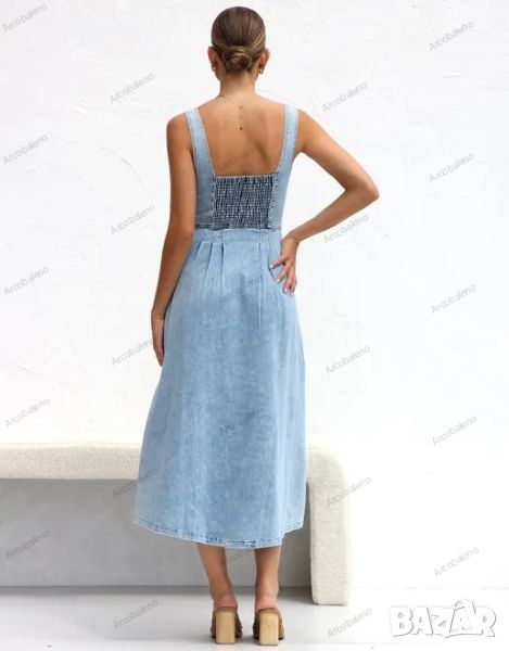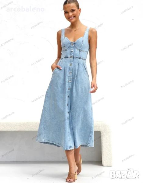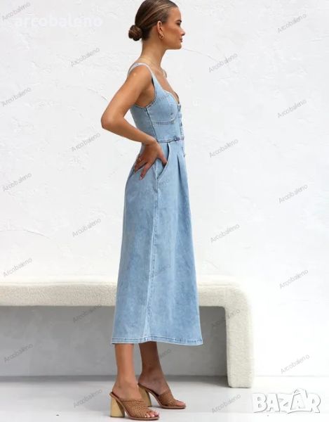 Светлосиня дамска дънкова миди рокля с копчета и тиранти