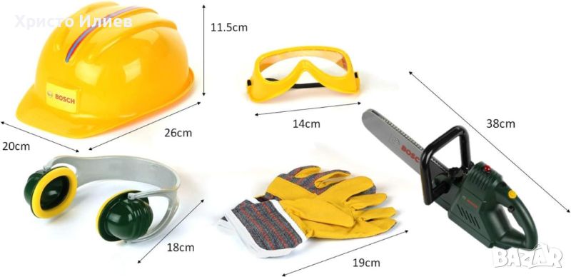 На път и на работа! Този комплект позволява на начинаещите домашни майстори – момичета и момчета – да се почувстват като истински професионалисти: те могат да си сложат каската и предпазните очила, работните ръкавици и наушниците като възрастни, преди да работят с верижния трион на оригиналния трион на Bosch, който бръмчи и мига впечатляващо, но е абсолютно безопасно: заоблените ръбове и дръжката, добре адаптирана към детската ръка, гарантират безопасна игра предпазното оборудване стимулира разбирането на детето за безопасност, но естествено остава играчка без истинска защитна функция Децата обичат да имитират родителите си и по този начин могат да се плъзнат по-лесно тяхната роля в пълната безопасност Верижен трион на Bosch с аксесоари Този комплект на Bosch съдържа играчки с инструменти, подходящи за деца, включително захранван с батерии резачка със звук и искра, много висококачествени ръкавици в един размер, строителна каска и антифони с регулируем размер и очила снабден с ластик - Размери: 40 cm x 11 cm x 13 cm - Подходящо за деца над три години - Необходими са батерии: 3 x R6-AA - Не са включени
