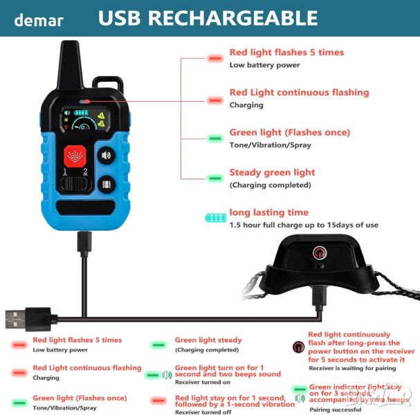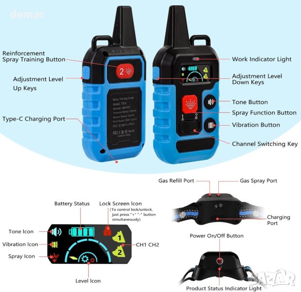 Тази ефективна и безопасна тренировъчна яка предлага четири сигурни режима - звук, вибрация, пръскане и силно пръскане - всички регулируеми на 1-6 нива чрез дисплей с висока разделителна способност. Идеален за обучение на кучета без сътресения, нашийникът пасва на породи от 10-130 lbs и има впечатляващ дистанционен обхват от 1000 фута за разнообразни тренировъчни среди, дори през стени. Неговият издръжлив, водоустойчив дизайн осигурява неограничено забавление на открито, докато удълженият живот на батерията поддържа до 15 дни за приемника и над шест месеца за дистанционното. Нашийникът включва подробно ръководство за оптимална употреба, предпазен превключвател и изисква спрей с цитронела (закупува се отделно). Дистанционното не е водоустойчиво.