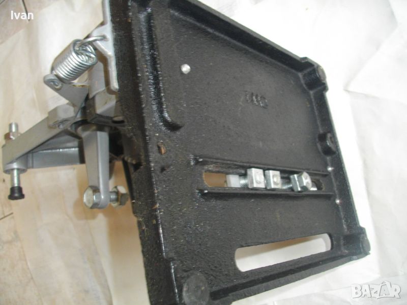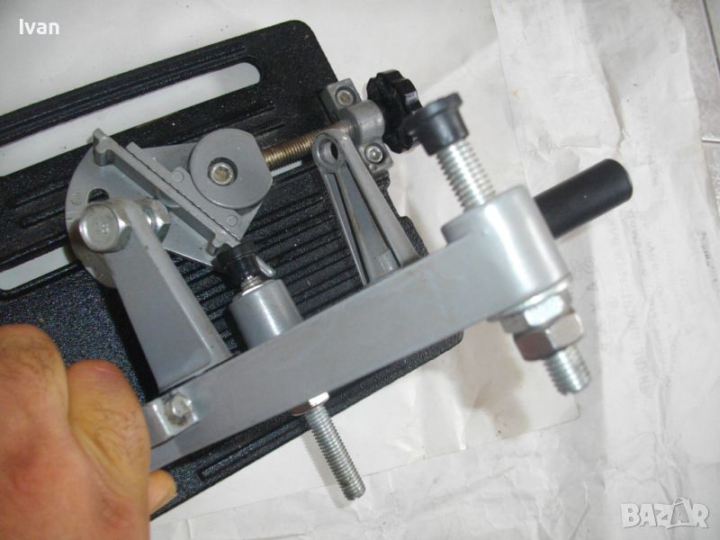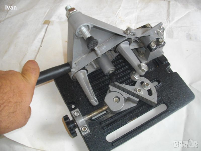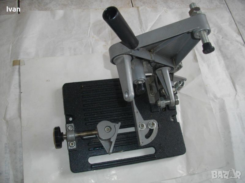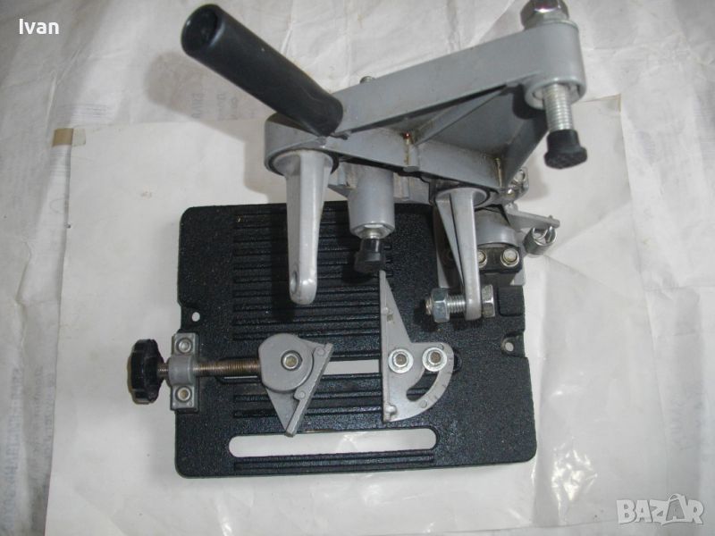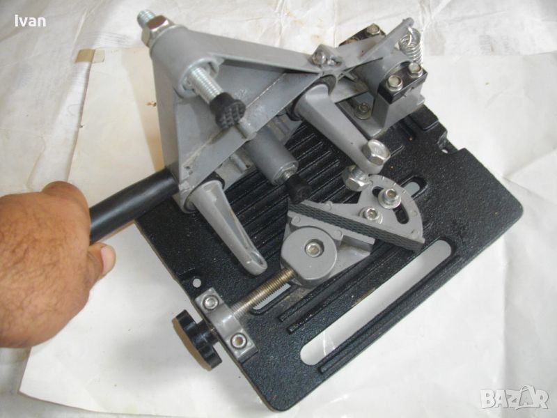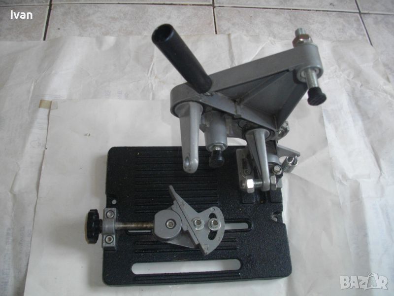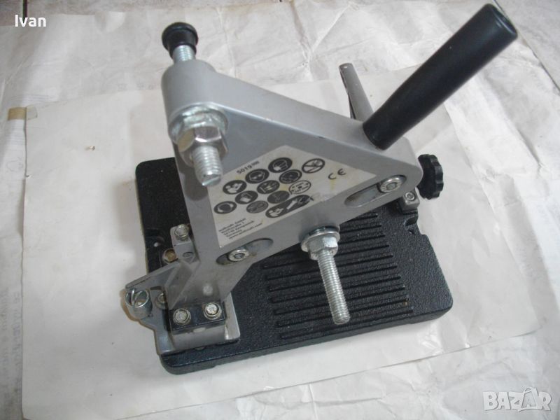 Почти нова, масивна, професионална стойка за ъглошлайф ф115 / ф 125 мм, немски оригиналн модел с чугунена основа на WOLFCRAFT. Стойка за ъглошлайф с възможност за работа с една ръка с ф115/125 mm