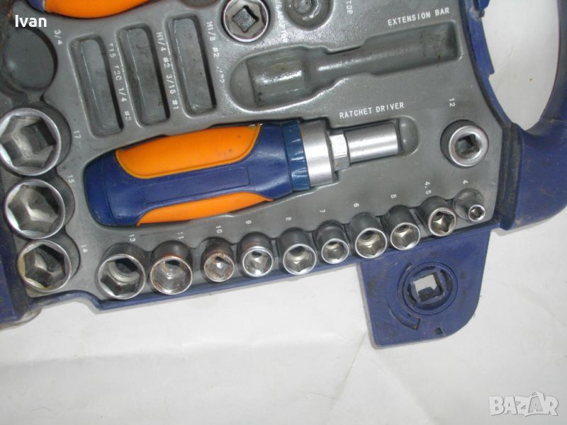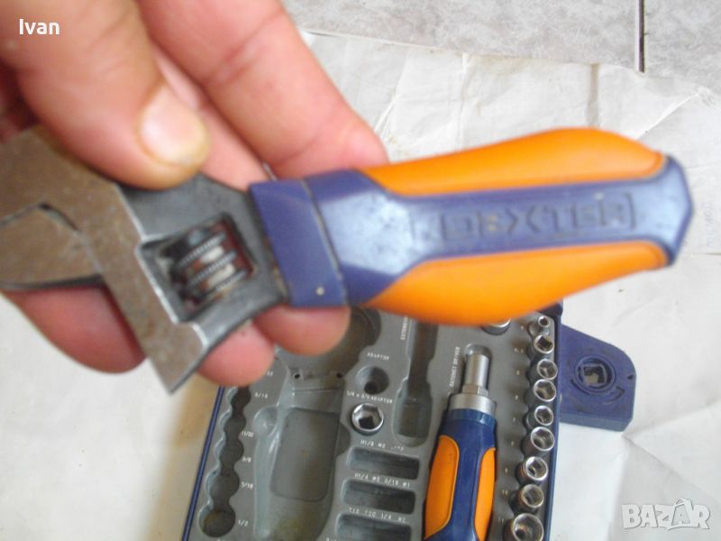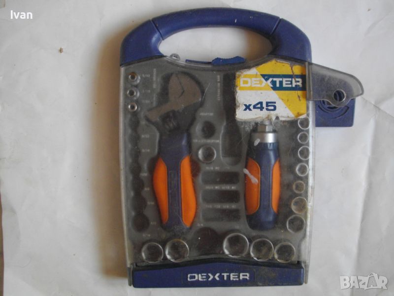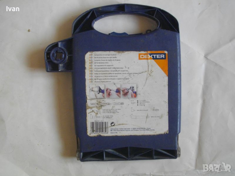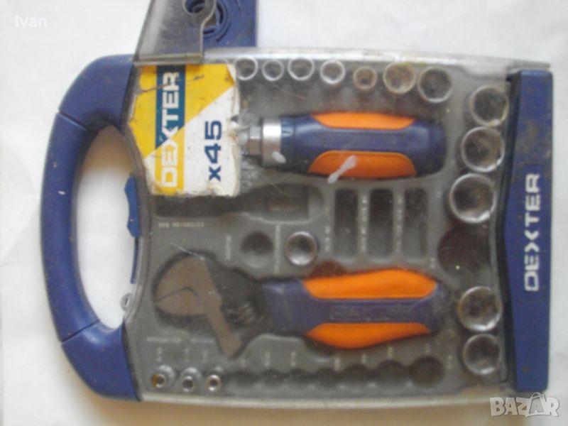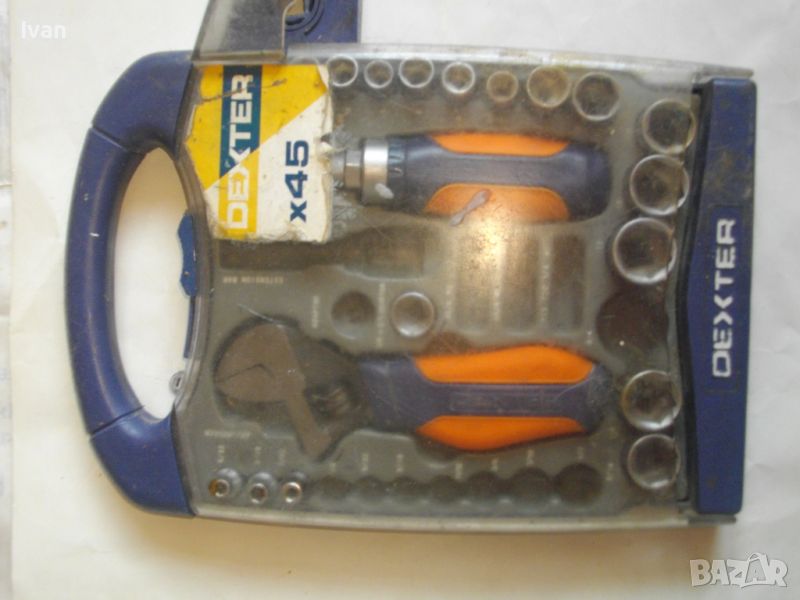 ОПИСАНИЕ на комплект раздвижен мини ключ с накрайници торсове - DEXTER - цена 79 лв. Комплектът е ползван и непълен. Общо налични 22 части. Мини развижен ключ, тип френски ключ, мини отвертка тресчотка за торсовете ,общо камъни вложки торсове накрайници - 20 бр. Размери на торсовете - от 4 мм до 17 мм. Здрава масивна кутия пластмасова с вградени вложки за местата на компонентите, с окачване за стена и със здрава закопчалка чрез приплъзване. Маркирано производство на комплекта на фабричния заден стикер - ADEO-FRANCE - производстевена база страна производител - Made in P.R.C. Поръчка на UA-Украiна.