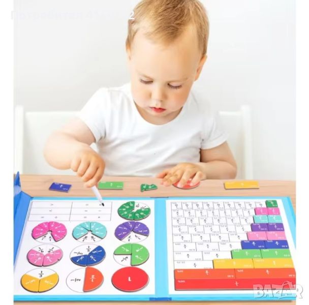 Магнитна книга за изучаване на дроби. Тя е създадена да улесни и представи нагледно същността на дробите, процентите, десетичните числа и тяхното съотношение. Книгата образова децата по интересен за тях начин с помощта на магнитни плочки, които да подредят на магнитната повърхност. С изтриващ маркер децата могат да пишат многократно върху книгата.
