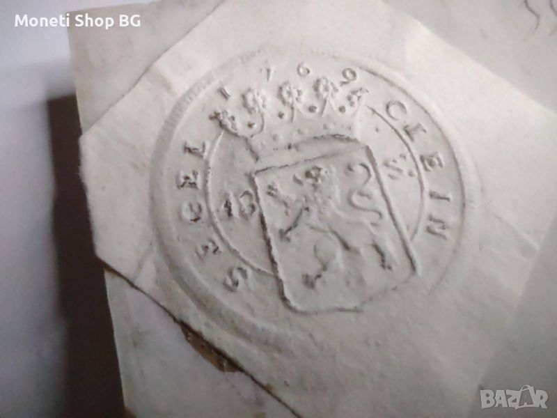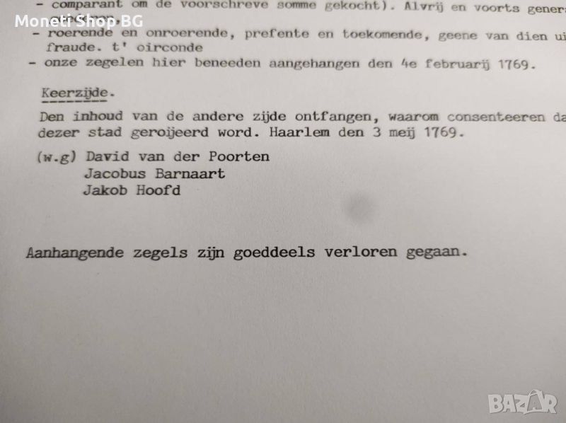 Харта на пергамент. Транспортен акт, съставен за г. Cornelis Arnout van Brakel и Mr. Адолф Хешуйсен, съветници в Харлем, Дейвид ван дер Пуртен, Якобус Барнарт и Якоб Хоофд, изпълнители на наследството на покойния Матейс Виткопс, прехвърлят собствеността на Йост Даамс Питерш., къща и имот, намиращи се в Grote Houtstraat до Харлем, наречен Вергулде Харт за сумата от 4500 гулдена. от Харлем на 4 февруари 1769 г.