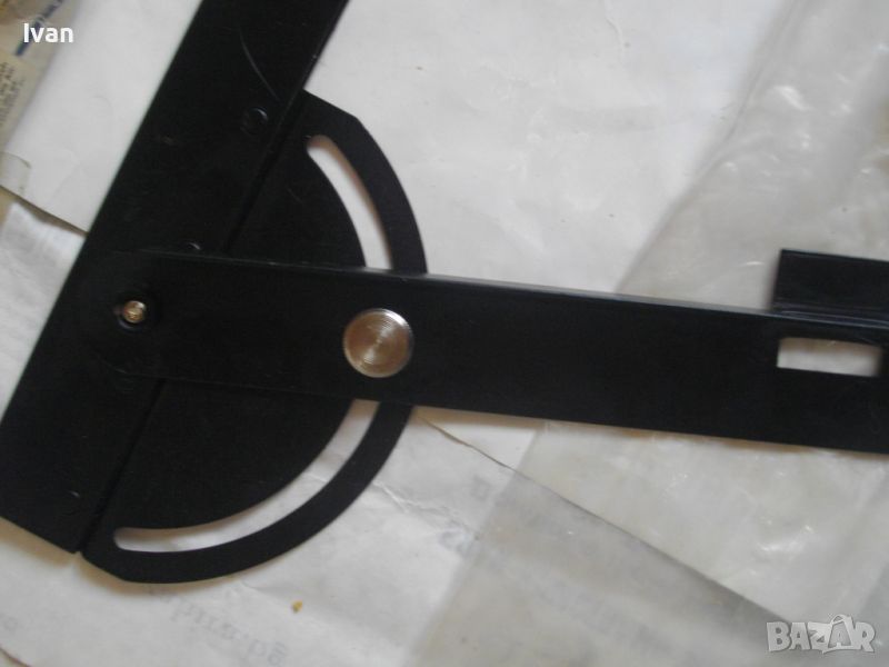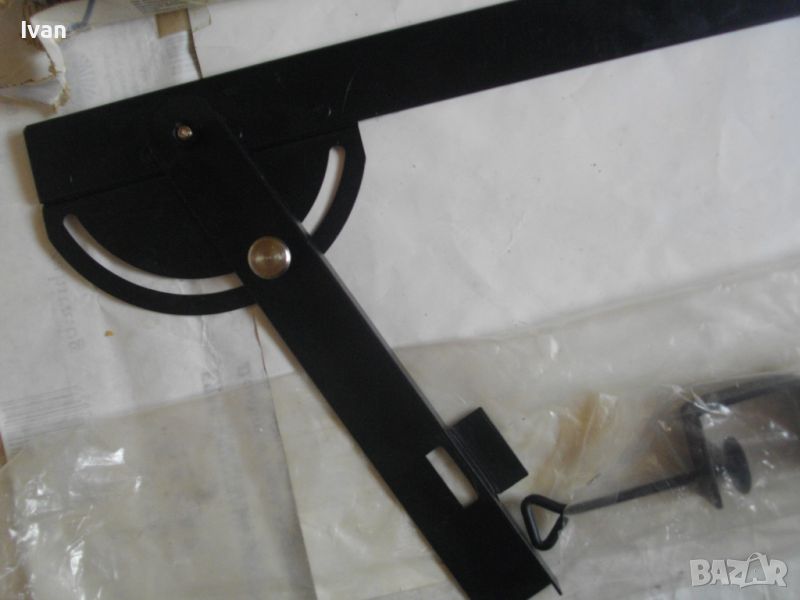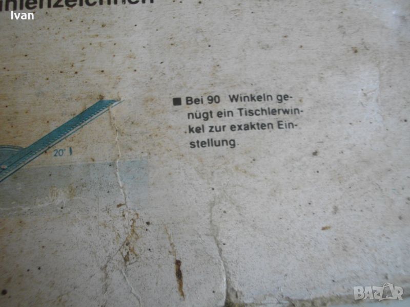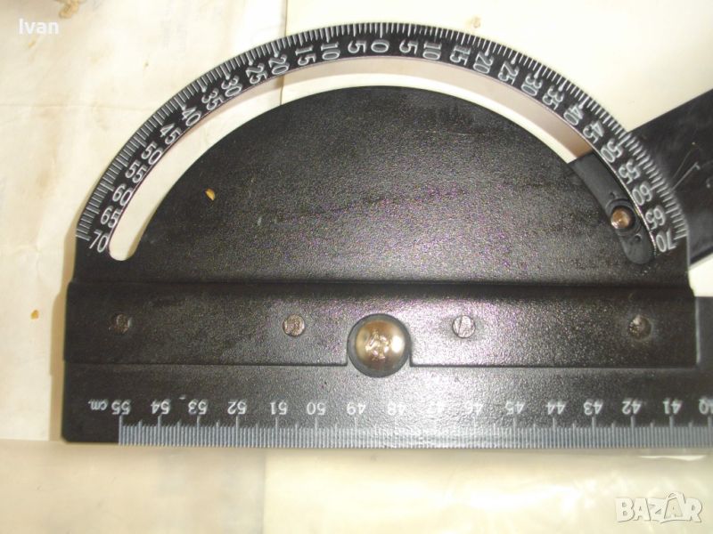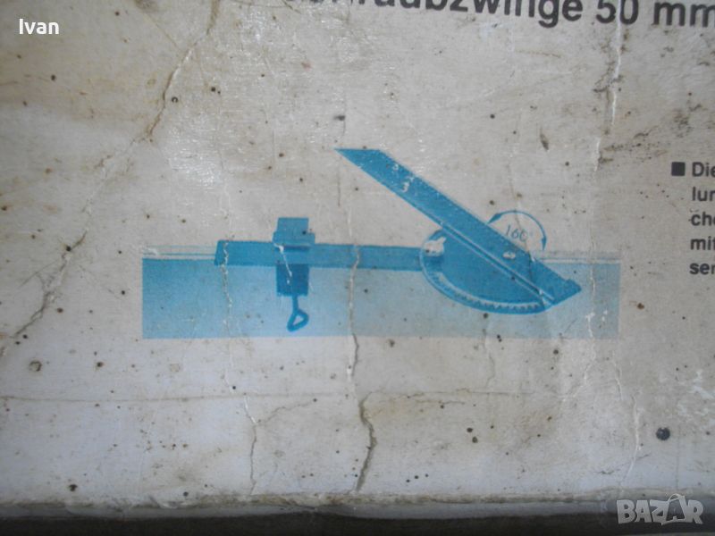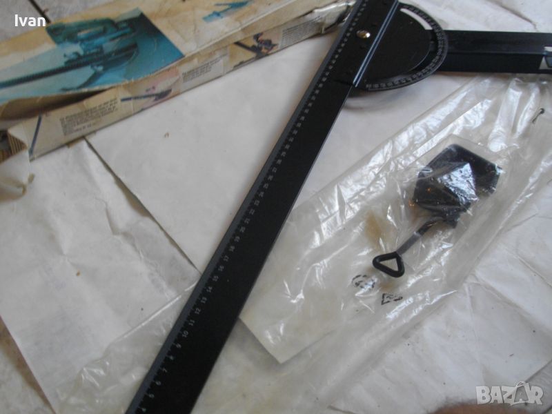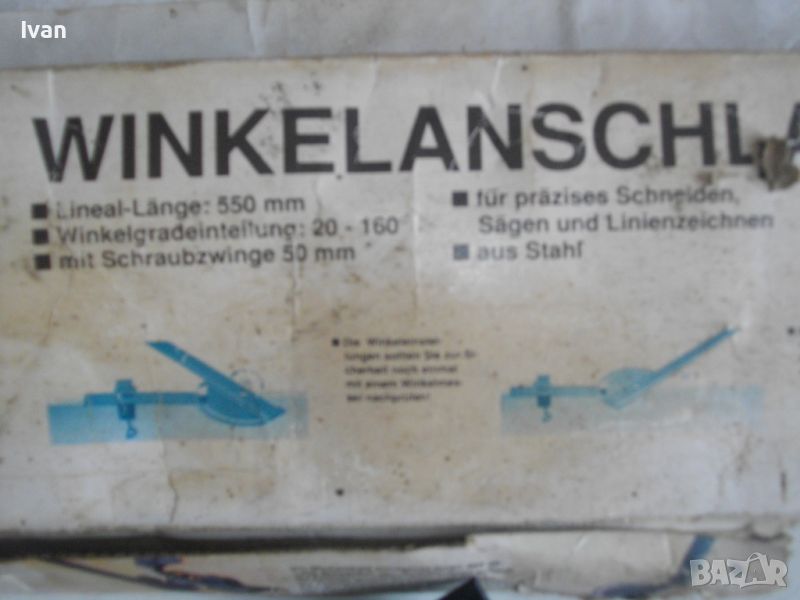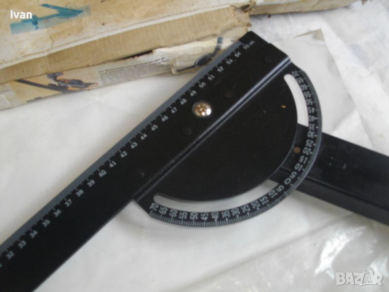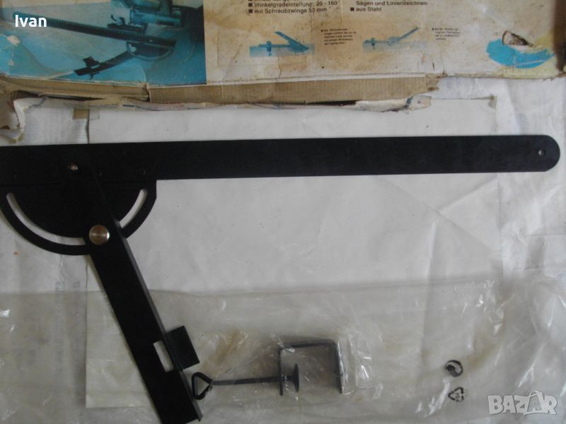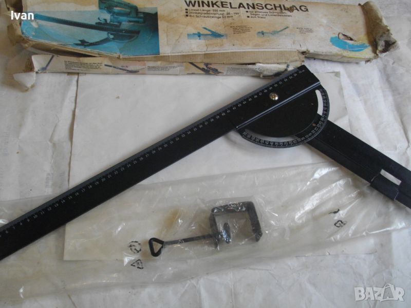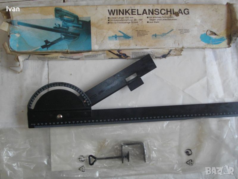 ОПИСАНИЕ на ръчен водач линеал за рязане под ъгъл за машина вертикален прободен трион зеге и за други подобни режещи машини - цена 99 лв. Немски оригинален. Съвсем нов, неиползван и неупотрбяван, в оригиналните си найлон и картонена опаковка кутия /леко разкъсана/. Професионален тип водач за прецизно и точно рязане под определеен градус и ъгъл. Към водача има голяма масивна стяга, с която се захваща към работна маса и по водача се реже с машина работната повърхност, която искаме да режем. Маркировки и вписвания - Lineal Lange - 550 mm. Winkelgradeinteifung 20-160 градуса. Mit Schraubzwinge 50 mm. Fur Prazises Scheidensagenung Linienzeichnen. Aus Stahl. Скалата за ъглово рязане е разграфена 0-70 мм прециизно през 1 мм. Дължина цялостна на инструмента 590 мм, разграфен линеал до 550 мм през 1 мм. Материал на водача скала - масивно дебело желязо. Стягата също е масивна. Захват на стягата до 60 мм отваряне. Градуси 20-160/ +/- 0-70. Наименование на водача -Winkelanschlan. Тегло на водача - 1,2 кг.