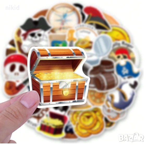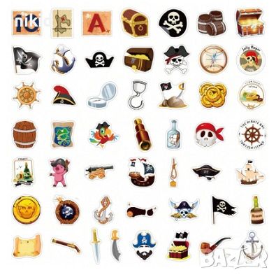 50 бр Пират Пирати пиратски самозалепващи лепенки стикери за украса декор картонена торта → Обява 46814590