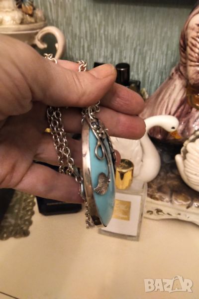 АРТ ДЕКО Огромно колие естествен ларимар и сребро от Америка .тежи над 55 грама ( синджира не е тежък ,те си вървят като комплект и не ги деля ) .Размер на колието 6,3 на 5,3 см .Синджир 60 см .Носено веднъж в перфектно състояние .КРАЙНА ЦЕНА БЕЗ БАРТЕРИ .