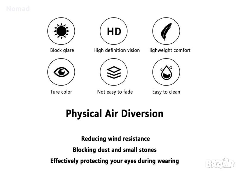 Професионален ергономичен дизайн, удобен за носене. Много подходящ за мотоциклети, велосипеди, туризъм, ски, риболов, голф, шофиране, пътуване и др. Лек и лесен за носене, може идеално да защити очите ви от вятър, ултравиолетови лъчи и прах.
