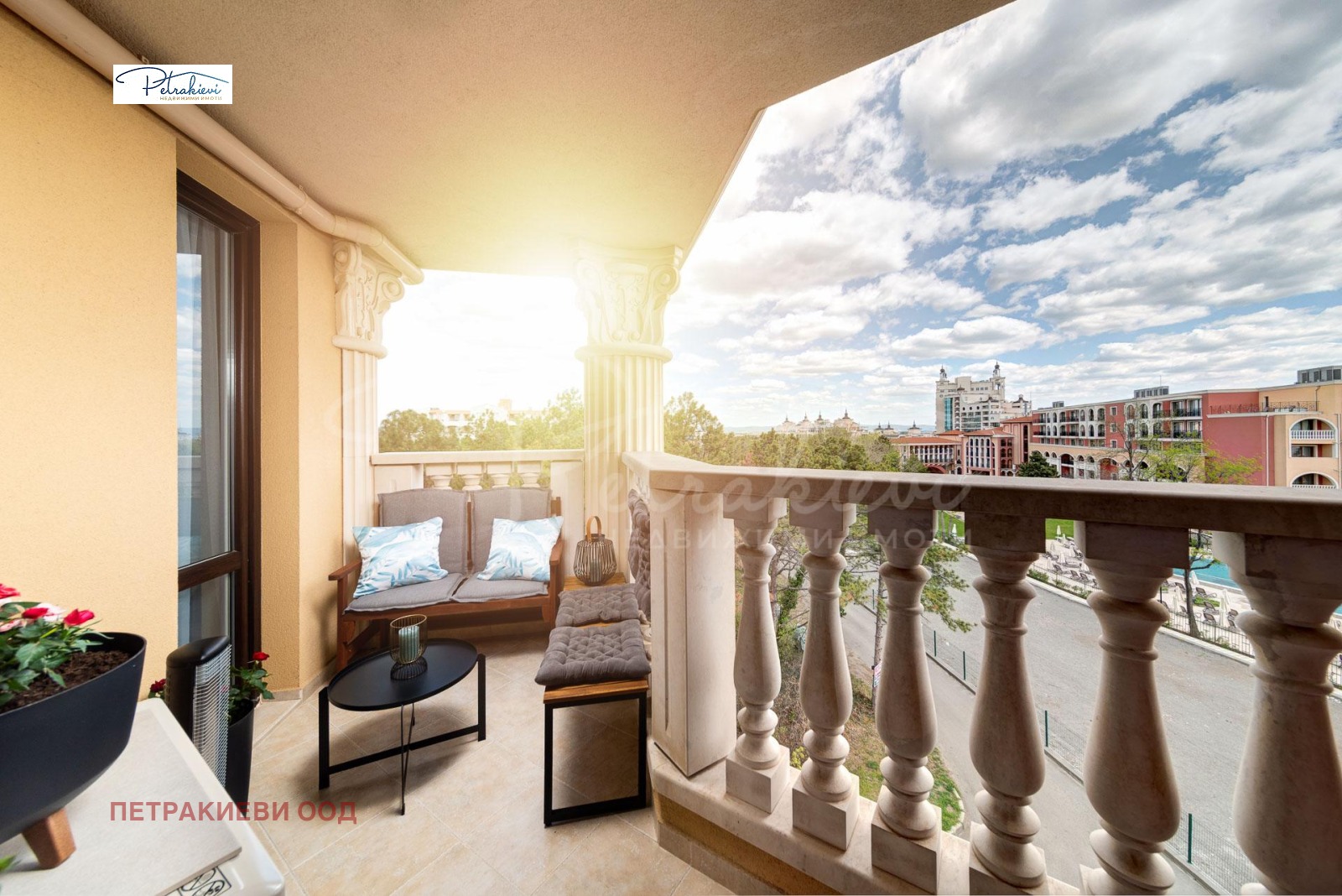 Петракиеви недвижими имоти представя дизайнерски двустаен апартамент с морска гледка на втора линия море в престижния петзвезден комплекс Флора Бийч, Поморие. Разположен в тих и спокоен район сред иглолистна гора, само на 150 м от брега на морето.