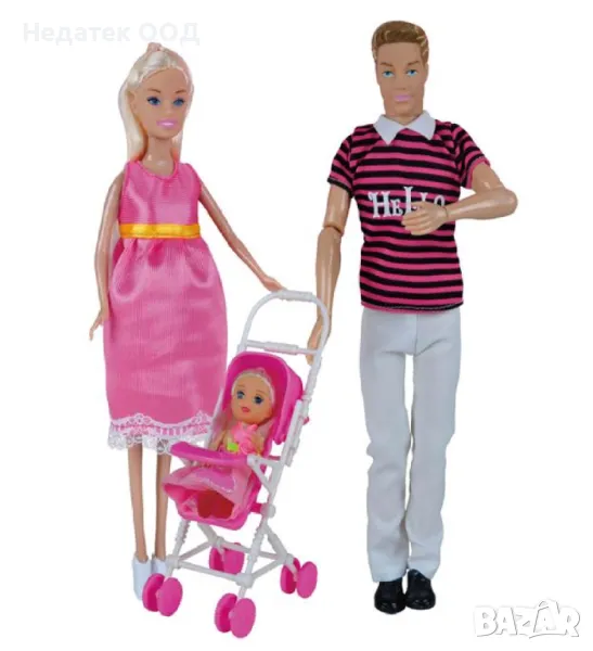 Щастливо семейство е излязло на разходка. Татко е с количката с момиченцето, а мама държи кучето. Мама е бременна, има бебе в корема си, което е готово да се роди. Може да се наложи да й помогнете да роди, внимателно да отворите корема й и да видите бебето. Заедно с много аксесоари за татко, мама и момиченце.