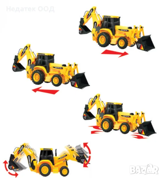 Строителна машина, багер двоен със звук. Има движение напред, върти се наляво и надясно и повдига и сваля рамото с кофата. Работи с 4 батерии АА (включени).