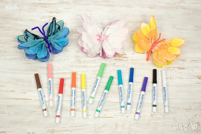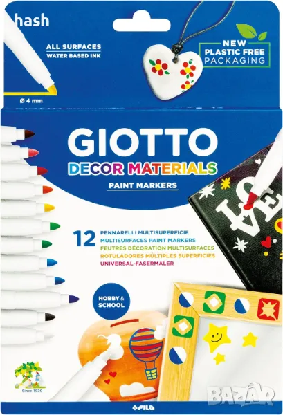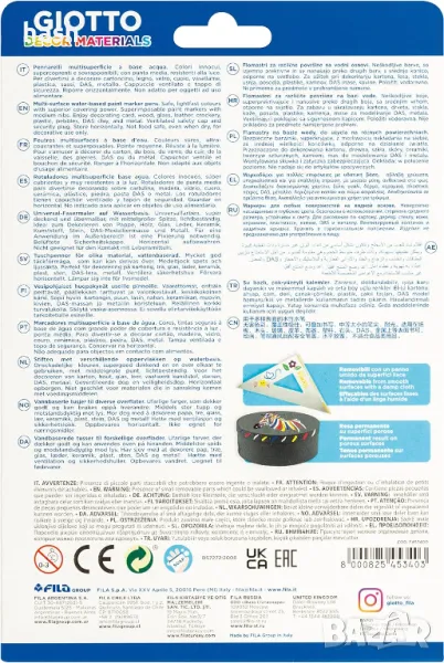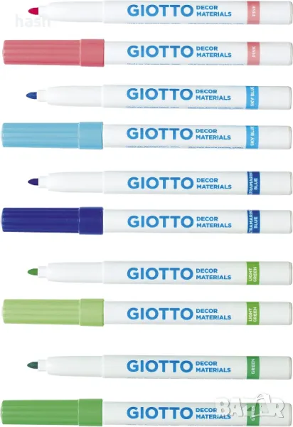 - Всички мастила на Decor Materials са на водна основа, безвредни, безопасни и светлоустойчиви; за разлика от обикновения маркер, с Giotto Decor можете да създавате красиви предмети благодарение на покритието - дори върху тъмни или цветни основи - и наслагването на цветовете.