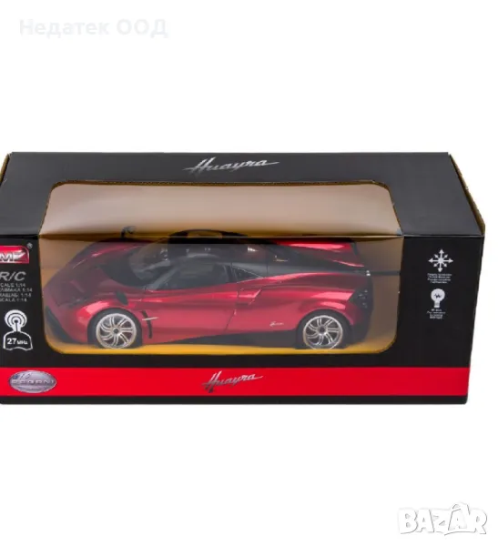 Huayra 27MHz RC кола с пълна работа, ръчно отварящи се врати и светлини. Работи с 1 батерия тип 9V за автомобила (не е включена) и 5 батерии тип AA за контролера (не са включени).