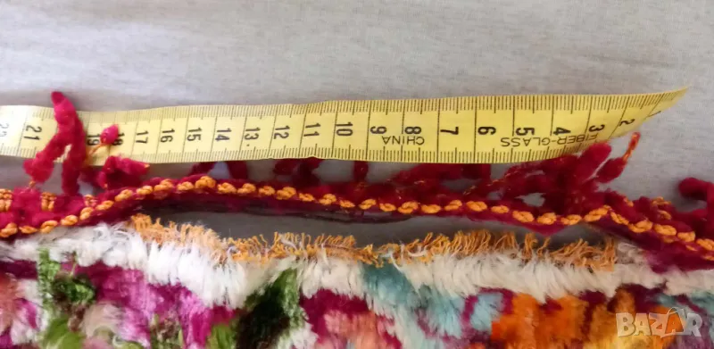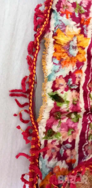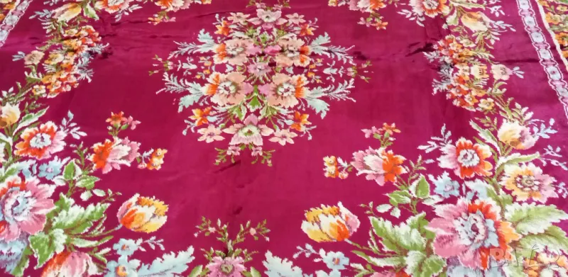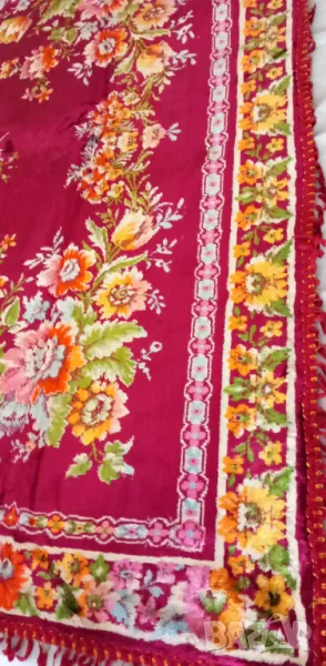 Покривката е купувана седемдесетте години на миналия век. Затова поставям състояние "използвано". Никога не е ползвана. Била е за чеиз. Цветовете са красиви и ярки. Единствената забележка е около 17см отпорване на ресните.