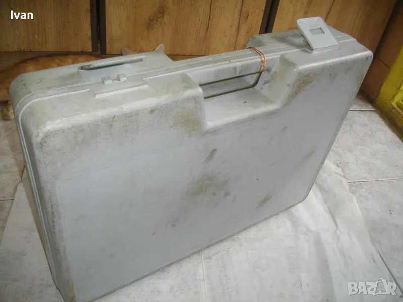 Масивен твърд голям пластмасов куфар с размери 525 х 380 х 100 мм, без пропуквания и без начупване по него. Копчалките не държат стабилно - вадят се от вградените жлебове.