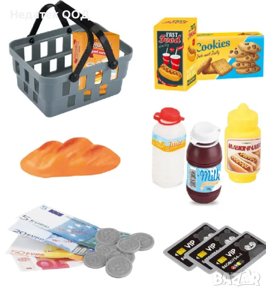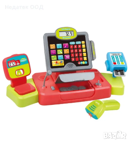 Реалистична игра с касов апарат с малък компютър с LCD екран, скенер със светлина и звук, плащане с карта на POS и кошница със стоки, които можете да пазарувате. Работи с 2 АА батерии за касовия апарат (включени) и 1 ААА батерия за скенера (включени).