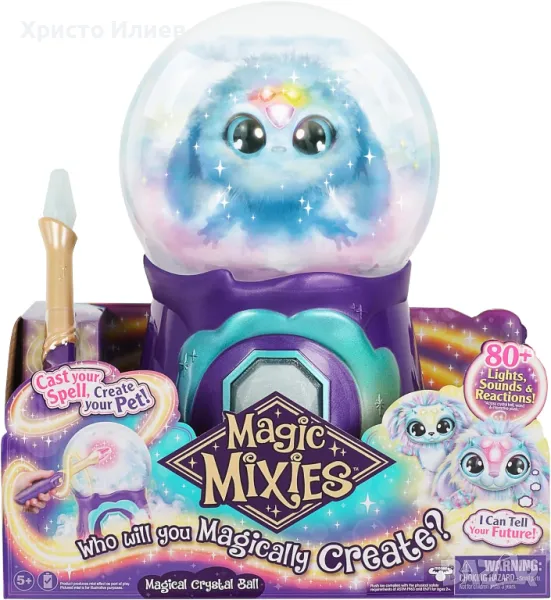 Истинската магия се завръща, когато направите своето заклинание и създадете домашен любимец в Magic Mixies Magical Crystal Ball! Създайте своя собствена микси за гадаене, като изпълните заклинанието за създаване с помощта на вашата светеща интерактивна магическа пръчка. Бъдете изумени, когато вашата кристална топка магически реагира на движенията на пръчката ви! За всяка стъпка от заклинанието за създаване ще трябва да овладеете правилното движение на пръчката и да кажете вълшебната дума за тази стъпка. Първо събудете кристалната топка, след това извикайте истинска магическа мъгла, преди да дадете гласа и цвета на своя Magic Mixie! След това го научете как да гадае, преди да кажете вълшебните думи „MAGICUS MIXUS“ и да съживите вашето Mixie! След това, когато мъглата се разсее, вашият Magic Mixie се появява! Тъй като магията и забавлението едва сега започват, използвайте магическата си пръчица, за да взаимодействате с вашия Mixie, като правите магии, играете заедно игра и гадаете! Повтаряйте разкриването отново и отново или използвайте магическата си кристална топка като нощна лампа! Кого ще създадете магически?