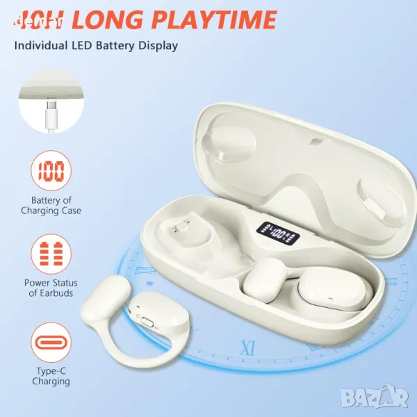 Изпитайте върховен комфорт с Open Ear Wireless Earbuds, проектирани за сигурно, нежно прилягане, идеални за дълги телефонни разговори, виртуални срещи, бягане и фитнес сесии. Насладете се на завладяващ HD звук с Bluetooth 5.4 и 15,4 мм динамичен драйвер, подобрен от двойни DSP шумопотискащи микрофони. Възползвайте се от незабавното сдвояване с автоматичен режим и безпроблемно повторно свързване, просто намерете „AIR02“ на телефона си. Калъфът за зареждане предлага над 40 часа с 8 пълни зареждания, включващ LED дисплей за състоянието на зареждане. С водоустойчив рейтинг IP67, тези слушалки са идеални за тренировки и дейности на открито, като гарантират издръжливост при всякакви условия.