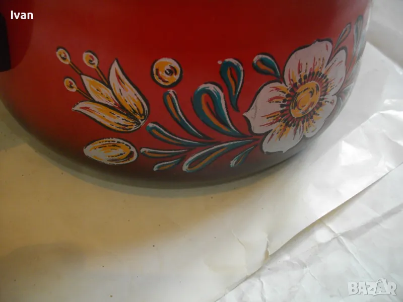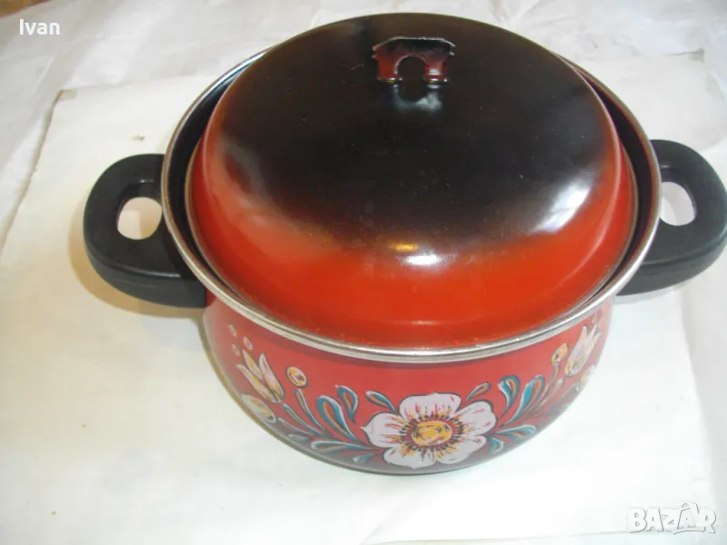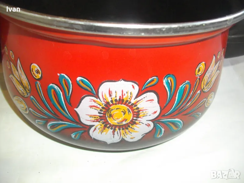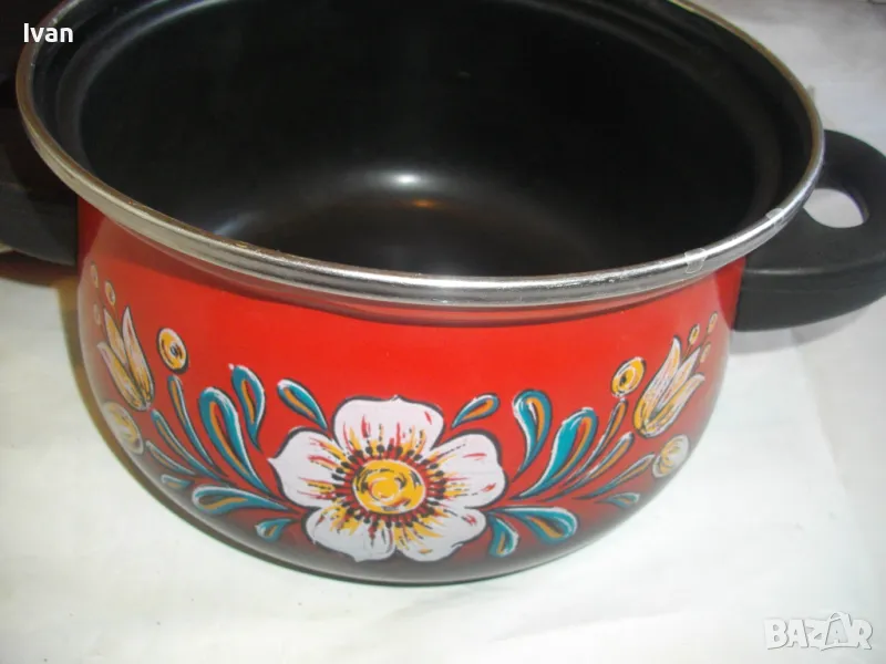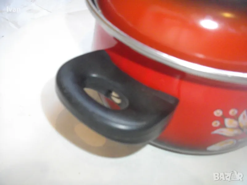 Цвят на тенджерата - наситен преливащ червен, с 2 големи цветя от двете страни.