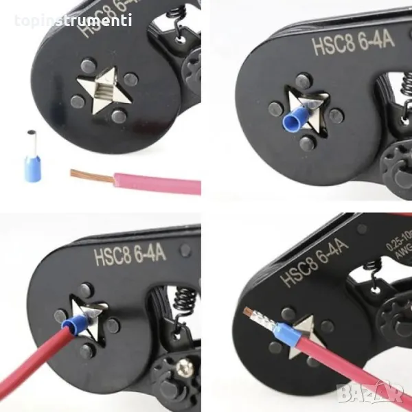 - Органайзер с 8 размера кабелни обувки – комплектът с инструмента за кримпване включва прозрачен органайзер, съдържащ 8 различни размера накрайници за кримпване (кабелни обувки) от 0.25 кв.мм до 10 кв.мм. Всеки размер се предлага в различен цвят.
