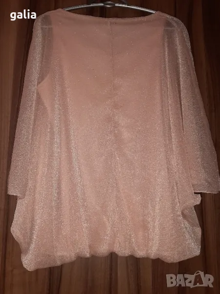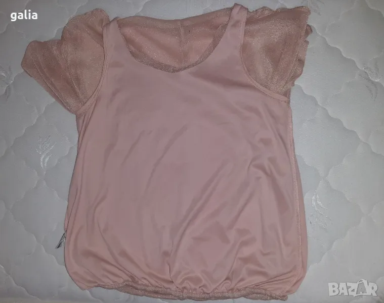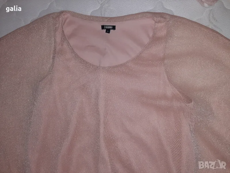 Нежен, ефирен топ. Дължина - 62 см. Ширина на ластика на талията в неразтеглено положение - 46 см. и в разтеглено положение - 72 см. По етикет е L размер, но според мен става и за M и за XL, тъй като и материята на потника/ подплата/ е с голяма разтегливост. В отлично състояние, не е носен.