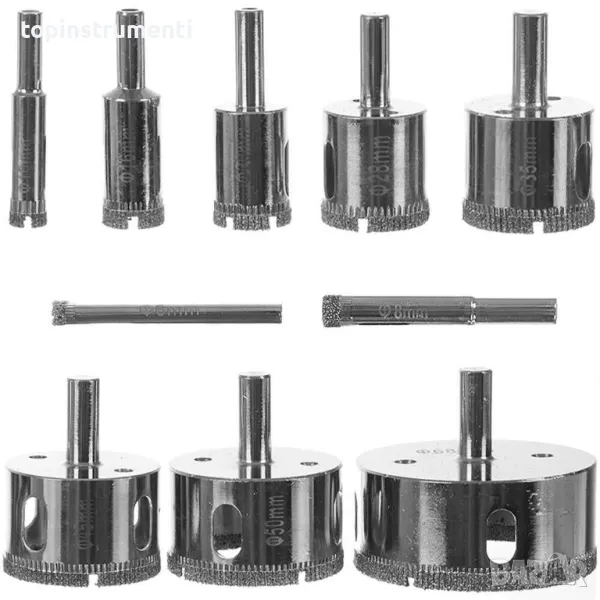 - 10x диамантени боркорони с размери: 6мм, 8мм, 10мм, 16мм, 20мм, 28мм, 35мм, 45мм, 50мм, 68мм