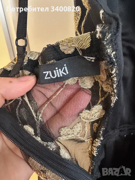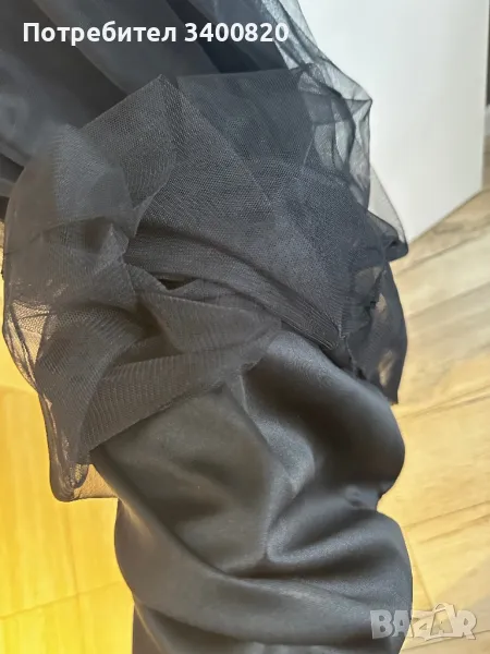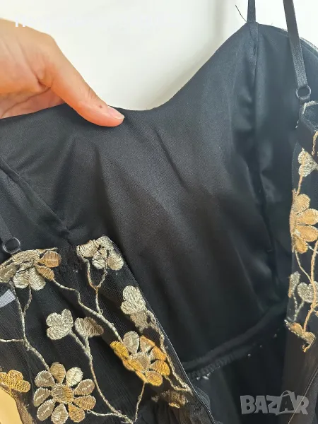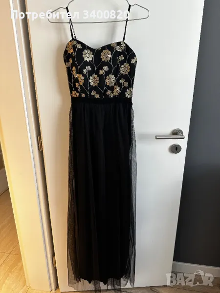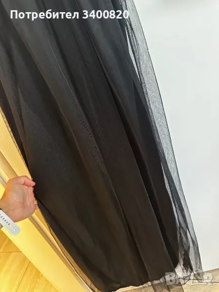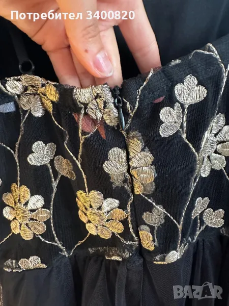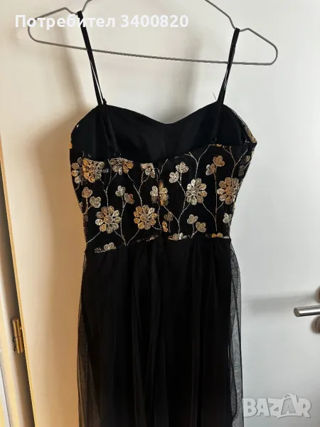 Роклята ми е подарък, обличана веднъж, няма никакви забележки. Размерът е между хс и ЕС. В горната част е подплънки, полата е тюлена. Като има подплата под тюла за да не прозира и боцка. Презрамките се регулират. Закопчава се с цип.