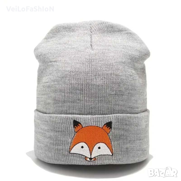Нова детска зимна шапка в черен, бял или сив цвят с Лисичка, подходяща за есенно-зимния сезон. Шапката е подходяща за деца от 4 до 15 години с обиколка на главата 52-55см