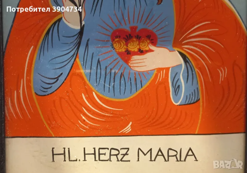 Ръчно рисувана икона-Святото Сърце на Мария.От средата на миналия век,внос от Германия.Размер в.26см.×ш.20см.С дървена рамка и стъкло.Много красива изработка !!!