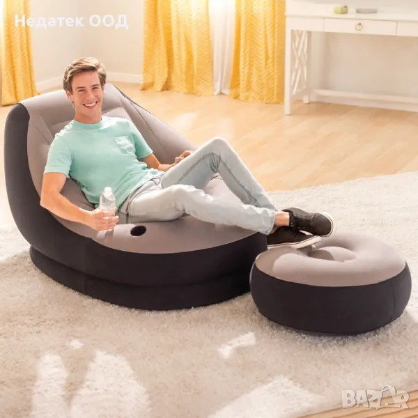 Комплект с фотьойл и табуретка. С удобен и елегантен дизайн и мека материя за повече комфорт. Фотьойлът е с поставка за бутилка. Идеален за вътрешна или външна употреба. Максимално тегло 100 кг.