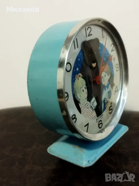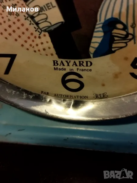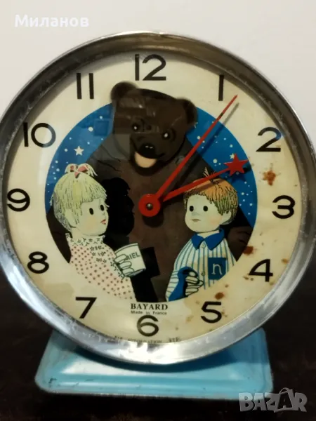 Стар механичен анимиран френски будилник Bayard.Работи и звъни, от 60-те години на миналия век.Диаметър-112 милиметра.Много рядък.Във Франция по телевизия излъчват анимация вечер, от 1962 до 1973 година.Идва мечката, и пита децата как е минал денят им.После им разказва приказка, а накрая върху спящите деца се посипва златен прах.Като Сънчо при нас...