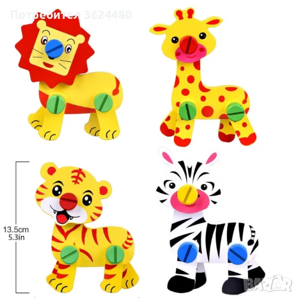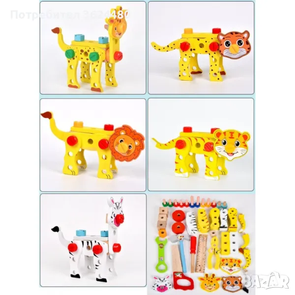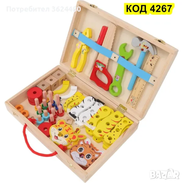Дървено куфарче с дървени инструменти, болтове, части за животни - общо 52 части